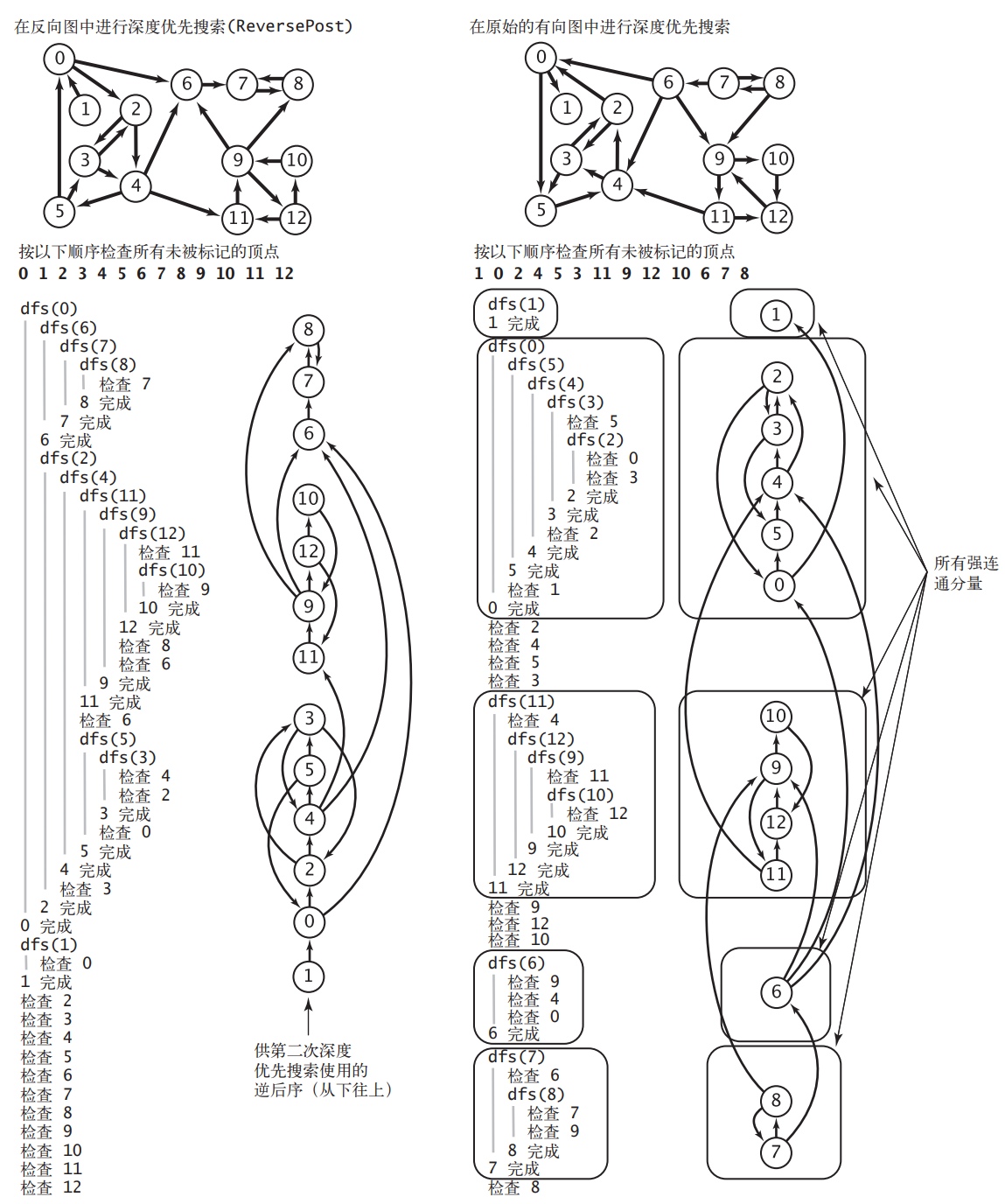 首先要用反证法证明“每个和 s 强连通的顶点 v 都会在构造函数调用的 dfs(G,s) 中被访问到”。假设有一个和 s 强连通的顶点 v 不会在构造函数调用的 dfs(G,s) 中被访问到。因为存在从 s 到 v 的路径,所以 v 肯定在之前就已经被标记过了。但是,因为也存在从 v 到s 的路径,在 dfs(G,v) 调用中 s 肯定会被标记,因此构造函数应该是不会调用 dfs(G,s) 的。矛盾。 其次,要证明“构造函数调用的 dfs(G,s) 所到达的任意顶点 v 都必然是和 s 强连通的”。设 v 为 dfs(G,s) 到达的某个顶点。那么, G 中必然存在一条从 s 到 v 的路径,因此只需要证明 G 中还存在一条从 v 到 s 的路径即可。这也等价于 G^R 中存在一条从 s 到 v 的路径,因此只需要证明在 G^R 中存在一条从 s 到 v 的路径即可。证明的核心在于,按照**逆后序(拓扑排序:所有的有向边均从排在前面的元素指向排在后面的元素)**进行的深度优先搜索意味着,在 G^R 中进行的深度优先搜索中,dfs(G,v) 必然在 dfs(G,s) 之前就已经结束了,这样 dfs(G,v) 的调用就只会出现两种