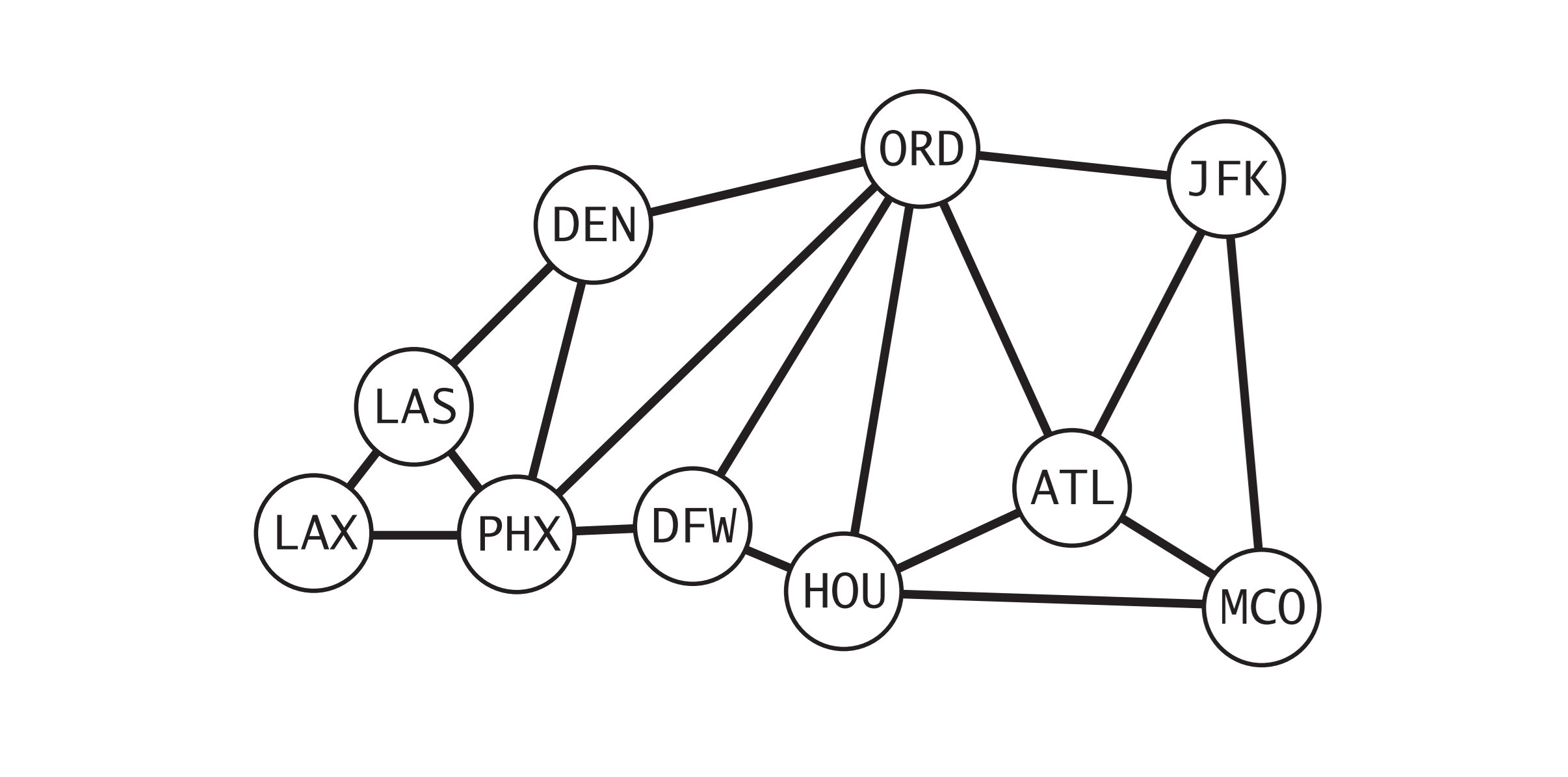 美国机场航线图上述用例输入的是根据一个小运输系统抽象出来的模型,具体的情况如上图所示。其中表示每个顶点的是美国机场的代码,连接它们的边则表示顶点之间的
