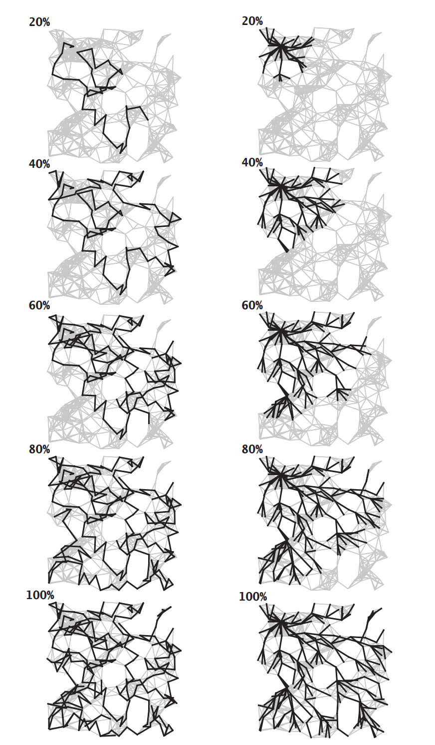 深度优先和广度优先区别上图,显示了深度优先搜索和广度优先搜索处理含有250个顶点图的过程,左图为深度优先搜索,右图为广度优先搜索,它们清晰地展示了两种方法中搜索路径的不同。深度优先搜索不断深入图中并在栈中保存了所有分叉的顶点;广度优先搜索则像扇面一般扫描图,用一个队列保存访问过的最前端的顶点。深度优先搜索探索一幅图的方式是寻找离起点更远的顶点,只在碰到死胡同时才访问近处的顶点;广度优先搜索则会首先覆盖起点附近的顶点,只在临近的所有顶点都被访问了之后才向前进。